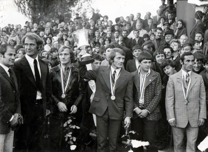 Stadion KS „Wisłoka” (1973). Powitanie medalistów mistrzostw świata. Stoją od lewej: Czesław Korzeń (trener), Janusz Tracewski (trener kadry), Kazimierz Lipień, Józef Lipień, Ryszard Świerad, Jan Michalik. Brakuje Andrzeja Skrzydlewskiego.