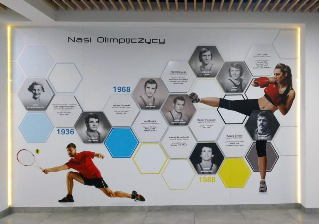Dębica (2023). Ściana z wize­run­ka­mi olim­pij­czy­ków w Domu Sportu (MOSiR). Fot. auto­ra