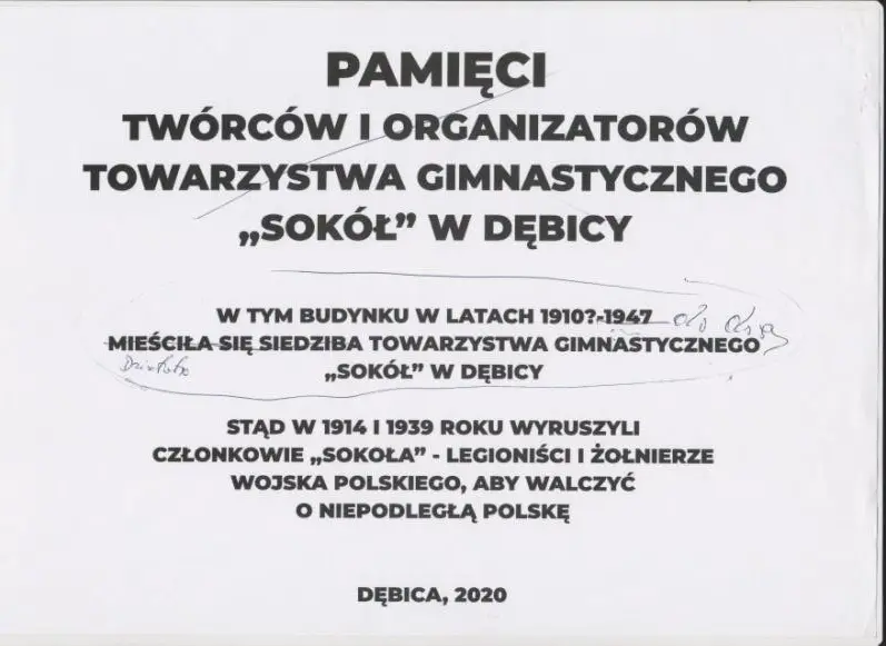 Zgodnie z zapowiedzią, na łamach „Dębickich Zeszytów Historycznych” ukazuje się druga część artykułu o pamiątkowej tablicy umieszczonej na zabytkowym budynku „Sokół” w Dębicy, wybudowanym w 1913 r. Niniejsza część miała być poświęcona rozważaniom na temat tego, co symbolizuje lub upamiętnia tablica. Jednak za sprawą zastępcy burmistrza Dębicy Macieja Małozięcia, który podzielił się interesującą informacją, zaszła konieczność dokonania zmiany pierwotnych planów. Stało się to z korzyścią dla historii oraz poszerzenia przygotowywanej analizy. Być może pojawią się i dalsze korzyści.