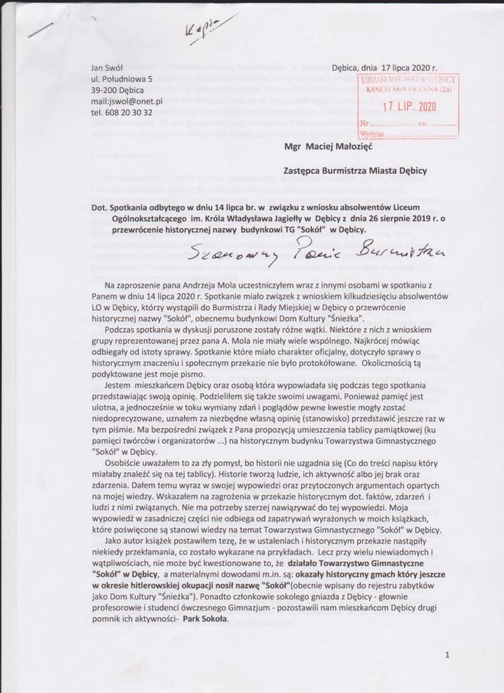 W jednej z odpowiedzi na wniosek autora o udostępnienie informacji publicznej Burmistrz Miasta Dębicy napisał: „W celu uhonorowania wieloletniej «służby» społeczeństwu miasta Dębicy przez Towarzystwo Gimnastyczne «Sokół» w Dębicy, z inicjatywą wykonania tablicy upamiętniającej działalność Towarzystwa Gimnastycznego «Sokół» w Dębicy wystąpili mieszkańcy, składając osobiście i telefonicznie ustne wnioski w tej sprawie”[7]. Czy sposób upamiętnienia towarzystwa satysfakcjonuje osoby, które składały osobiście i telefonicznie ustne wnioski? Czy poznamy ich opinię?