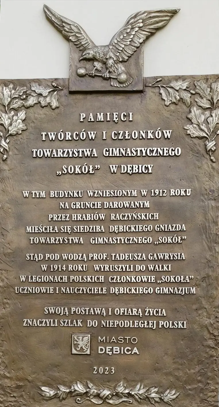 Stąd pod wodzą prof. Tadeusza Gawrysia w 1914 roku wyruszyli do walki w Legionach Polskich członkowie „Sokoła”, uczniowie i nauczyciele dębickiego gimnazjum.